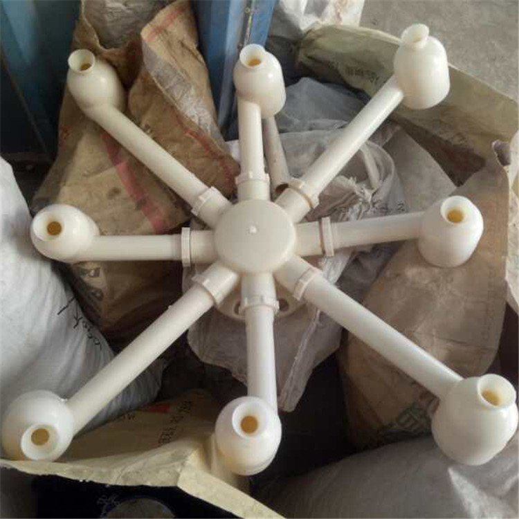 喷头是冷却塔配水系统的重要组成部分,其作用是将冷却水喷溅成细小水滴,均匀地布洒到填料上,以达到较高的冷却效果。冷却塔工作性能的优劣与所采用的喷溅装置的形式以及工作状况的好坏有很大关系,进入冷却塔中的水能否沿着淋水面均匀地分配,对冷却塔的冷却效果具有十分重大的影响。当水的分配不当时,会出现大片非淋水区或不良淋水区,从而减小了冷却面积,降低通风能力。有资料表明,如果4000m2冷却塔的不均匀系数由0.0增加到0.2,出塔循片水温度将会升高0.5℃,其变化呈几何级数增加的趋势。因此,在其它条件不变的情况下,改善冷却塔的布水情况和淋洒的分散均匀性,将会提高冷却塔的换热效率。而提高淋水的分散均匀性主要由喷溅装置的水力特性来保证,其包括流量系数、不均匀系数和喷溅半径等,不同结构形式的喷溅装置由于水力特性不同将会有不同的冷却换热效率。