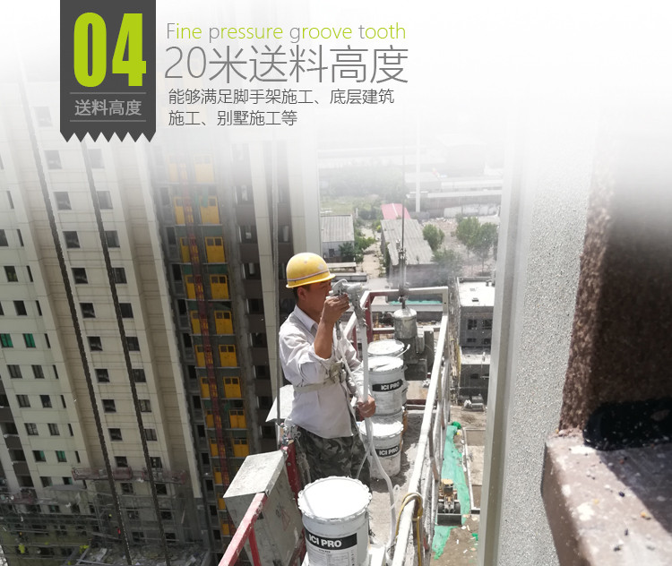 真石漆喷涂机满足多种施工方式,吊篮施工,脚手架钢管施工,吊绳施工,多种施工方式结合。同时可满足脚手架20米施工,让你施工更方便