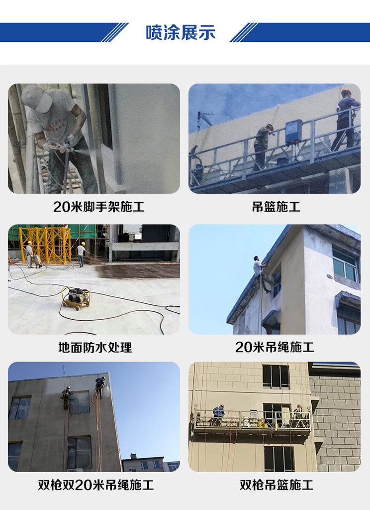 真石漆喷涂机满足多种施工方式,吊篮施工,脚手架钢管施工,吊绳施工,多种施工方式结合。同时可满足脚手架20米施工,让你施工更方便