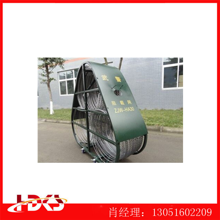 防暴阻隔网采用蛇复型伸缩刀片钢刺网,两端为支撑框架结构,操纵一端框架可快速完成布障和收网,伸缩网和框架一体式坚固联接,整体结构坚固稳定。