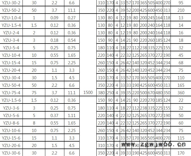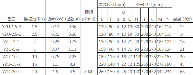 YZD系列振动电机相关技术参数:
