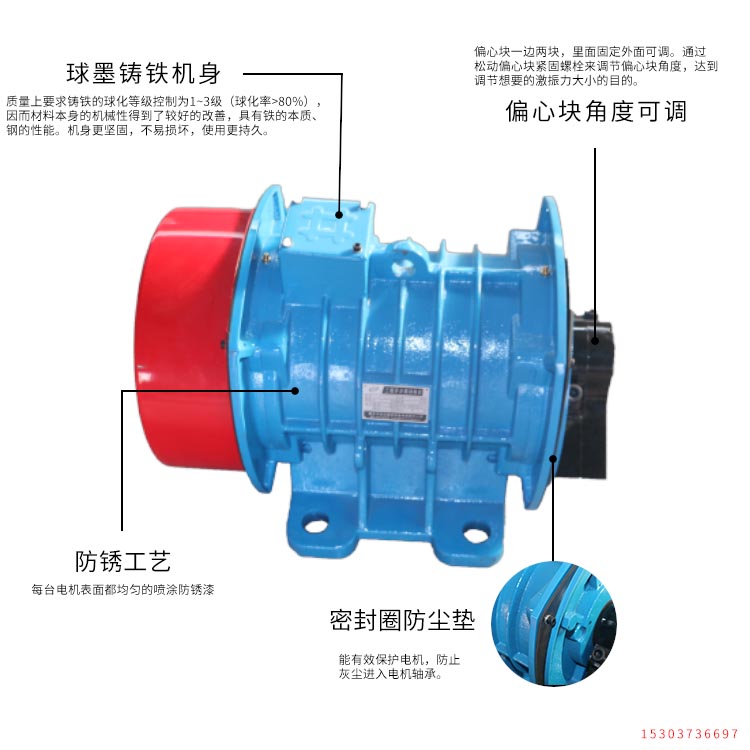 | MV振动电机的概述 MV振动源三相异步电动机(简称振动电机)集动力源和振动源为一体,是一种高效节能的通用性激振源,体积小,激振力大,结构可靠,使用维护方便。MV振动电机广泛应用于矿山、电力、化工、粮食加工、冶金、铸造、轻工、医药等行业。是实现粉状、粒状、块状等散体料机械化筛分、输送、破碎、充填、防堵塞的理想激振源。MV振动电机可单机使用,也可多机组合使用。 MV振动电机使用条件 MV振动电机满足下列条件时,能连续输出额定激振力 ?? 1.振动加速度:不超过7g(g:重力加速度) 2.环境温度:不超过40℃。 3.海拔:不超过1000m 4.电源频率:50HZ 5.电压:380v 6.温升:小于80K(电阻法) MV振动电机型号说明 MV振动电机产品型号由三部分组成 MV 8-2 MV---振动电机 8---**大激振力(千牛顿) 2---极数