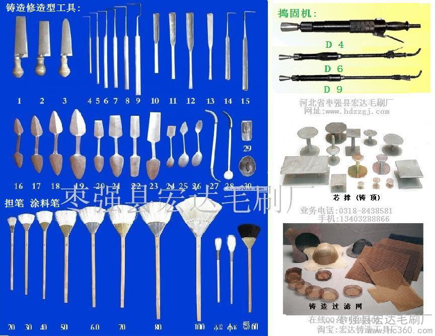 枣强县宏达毛刷厂专业生产:铸造工具 翻砂工具 铸工工具 造型工具 铸顶 芯撑 担笔 涂料笔 扫笔 圆水笔 压勺 提钩 提勾 刮刀 钢批 竹鞭梗 郎头勾 法兰勾 铸钉 铸造卡子 撑头 撑铁 泥芯撑 支柱 铸造过滤网 铸铁过滤网 铸铝过滤网 捣固机 熔断棒 氧熔棒等制造用品
