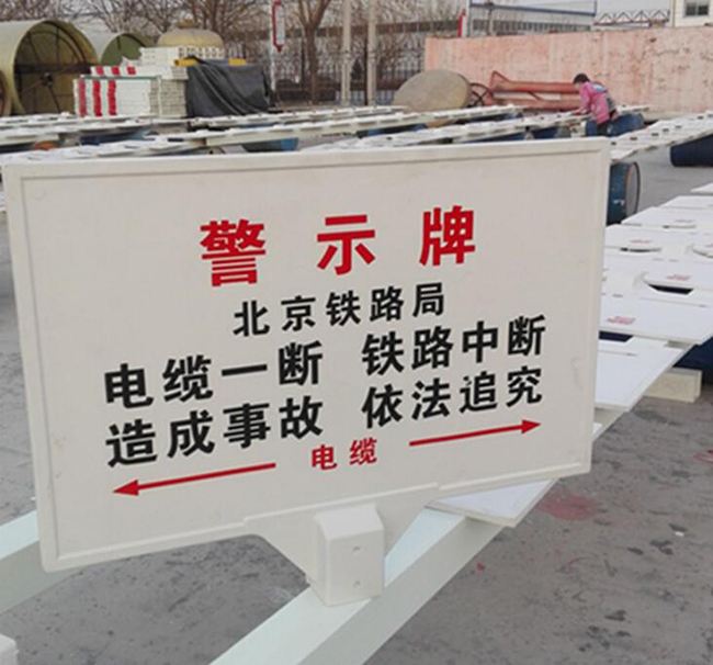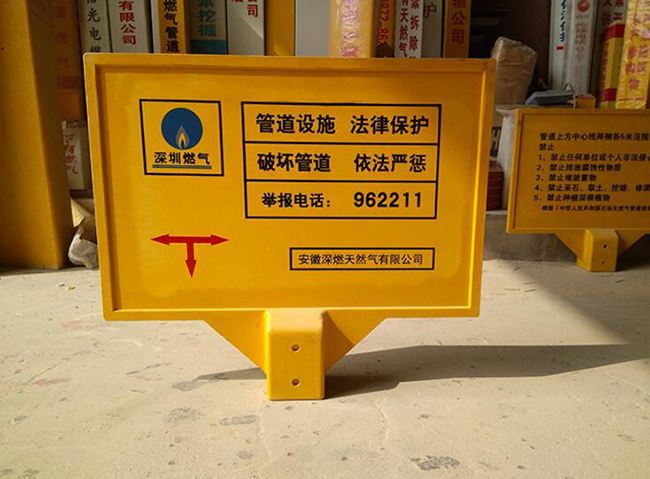 用于标记埋地管道的转向、管道与地面工程(地下隐蔽物)交叉、管理单位交界、管道结构变化(管径、壁厚、防护层)、管道附属设施的地面标记。常见为闹市、风景区、绿化带、灌木丛、管两侧管线路径指示作用。输油管道标示牌又叫输气管道标示牌、电力电缆标示牌、矿区指示标示牌、交通警示标示牌、户外指示牌等。