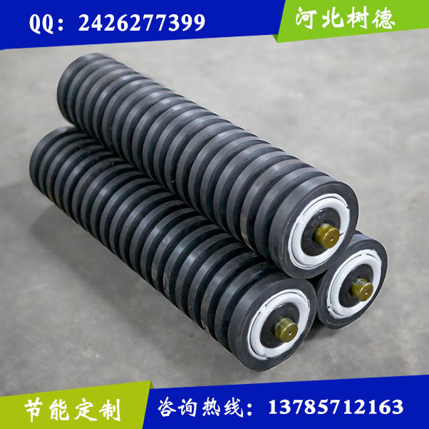 缓冲托辊表面由冷钻接连体弹性胶环和锁环构成,缓冲托辊安装在输送机受料段的下方,减少输送带所受的冲击,延长输送带使用寿命。缓冲托辊主要起缓冲作用。缓冲托辊用于带式输送机受料处减缓落料对输送带的冲击,缓冲托辊主要针对洗煤厂、焦化厂、化工厂等腐蚀性环境而研制的一类托辊,缓冲托辊本身具有的韧性是普通金属的10倍以上,缓冲托辊寿命为传统柱鞋的五倍,耐腐蚀阻燃、抗静电、自重轻等特点,广泛用于矿山开采。