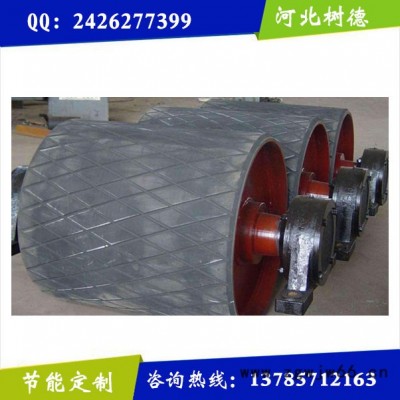 本系列传动滚筒根据承载能力分为轻型、中型和重型三种。其中轻型:轴与轮毂为单键联接的单附板焊接筒体结构。中型 : 轴与轮毂为胀套联接的单附板焊接筒体结构。重型:轴与轮毂为胀套联接,筒体为铸焊结构,有单向出轴和双向出轴两种。同一直径的滚筒有些还配备了几种轴颈和轴承座中心距。河北树德传动滚筒表面全部为胶面,其形状有左向人字型、右向人字形和菱形三种。用户需要光面传动滚筒时,需特殊订货。滚筒轴承座采用压注油嘴润滑。若采用集中润滑时需于订货是提出,我们会为客户另行配置油嘴。