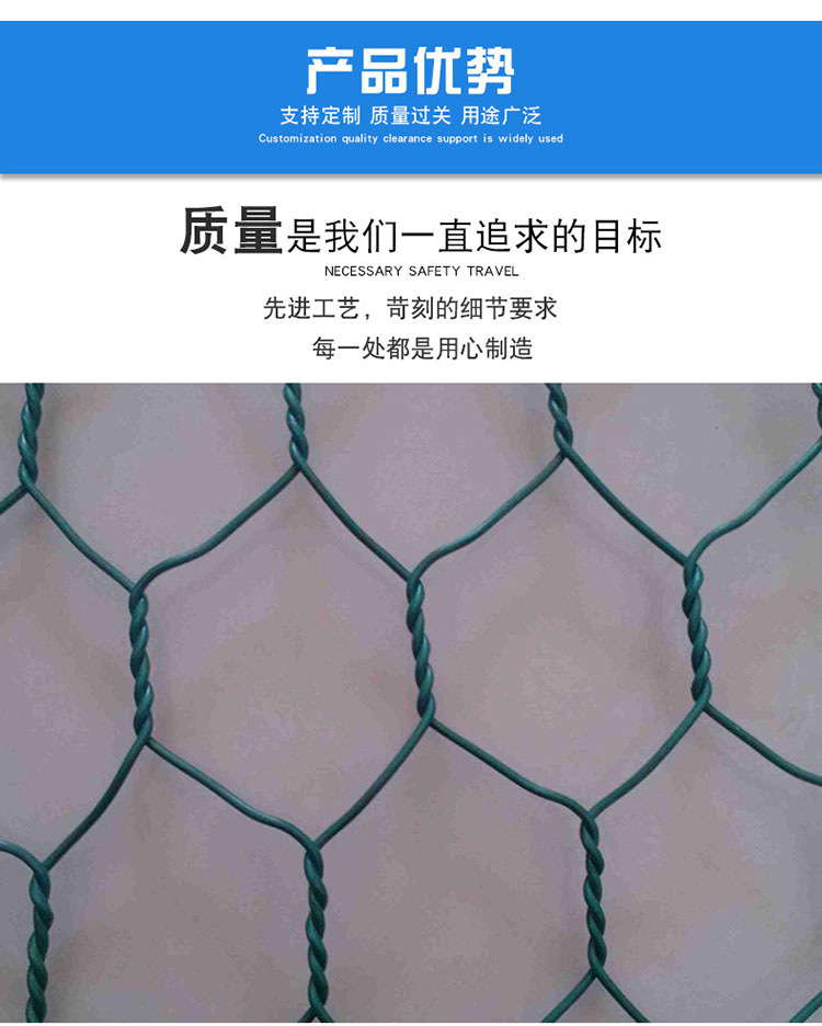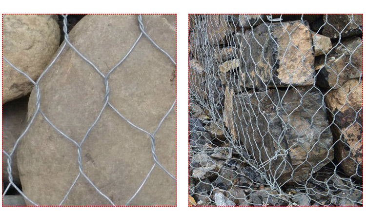 ?石笼网由高抗腐蚀、高强度、具有延展石笼网箱性的低碳钢丝或者包覆PVC的以上钢丝使用机械编织而成,使用该网制作而成的箱型结构是石笼。根据ASTM和EN标准,所使用的低碳钢丝直径根据工程设计要求而不同。一般介于2.0-4.0mm之间,石笼网钢丝的抗拉强度不少于38kg/m2,金属镀层重量一般高于245g/m2,石笼网片的边缘线直径一般要大于网线直径。其双线绞合部分的长度不得小于50mm.以保证绞合部分钢丝的金属镀层和PVC镀层不受破坏。