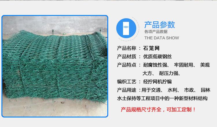 石笼网由高抗腐蚀、高强度、具有延展性的低碳钢丝或者包覆PVC的以上钢丝使用机械编织而成,使用该网制作而成的箱型结构是石笼网箱。根据ASTM和EN标准,所使用的低碳钢丝直径根据工程设计要求而不同。一般介于2.0-4.0mm之间,石笼网钢丝的抗拉强度不少于38kg/m2,金属镀层重量一般高于245g/m2,石笼网片的边缘线直径一般要大于网线直径。其双线绞合部分的长度不得小于50mm.以保证绞合部分钢丝的金属镀层和PVC镀层不受破坏。