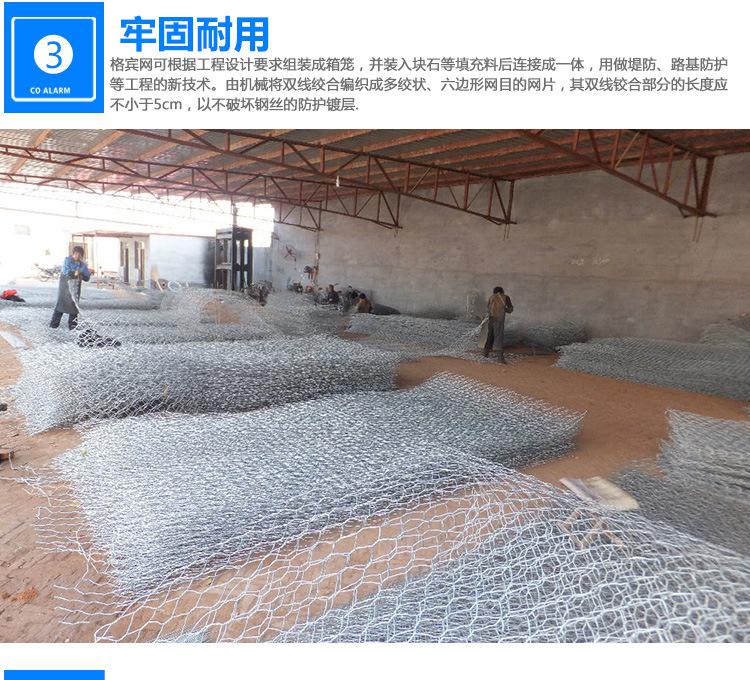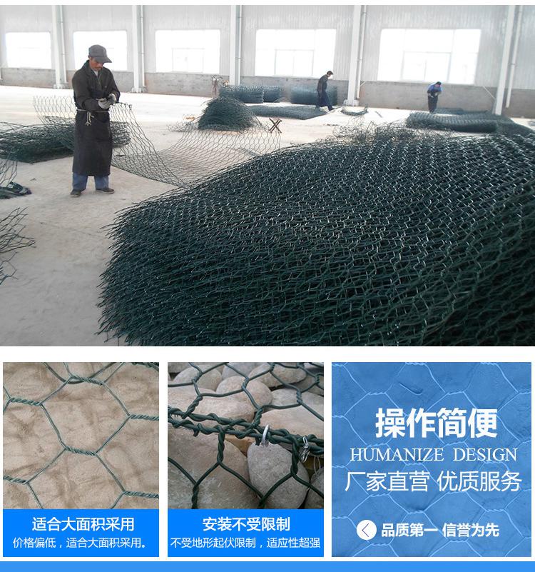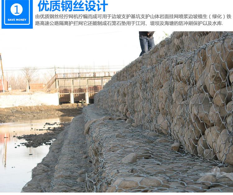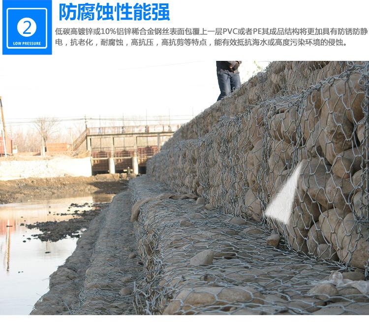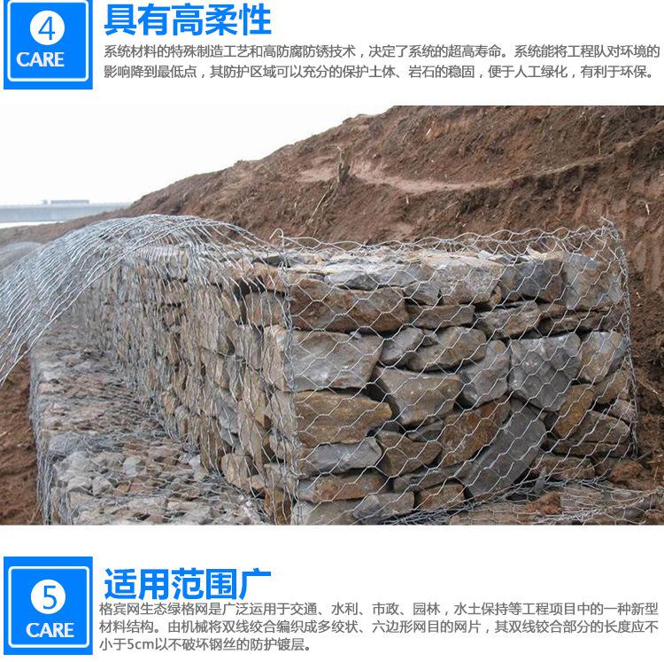 石笼网可用于边坡支护、基坑支护、山体岩面挂网喷浆、边坡植生(绿化)、铁路高速公路隔离护拦网,它还能制成箱笼、网垫,用于江河、堤坝及海塘的防冲刷保护,水库、河流截流用网箱。河流严重的灾害是水流冲刷河岸使其破坏,引发的洪水泛滥,导致生命财产遭受大量损失和大量水土流失。因此在处理上述问题时侯,格该生态格网结构的应用成为**的解决方案之一,它能使河床河岸得到坚固性保护。