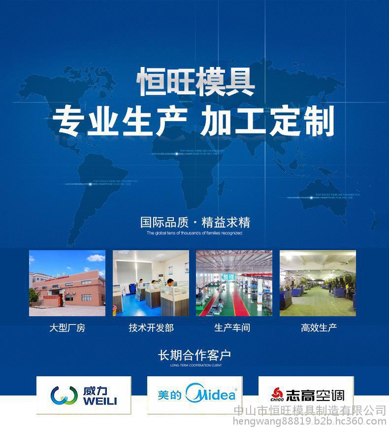 我司专业设计和制作各种五金冲压模具,五金制品冲压和钣金件加工。公司地址位于中山市东升镇工业区内,毗邻105国道和中山小榄港,交通极其便利,生产车间面积为五千平方米。我司拥有10多人的专业研发设计团队和45人的**模具技师,并拥有15人的**专业管理人员,普通技师100多人。同时恒旺模具还拥有多台进口大型CNC、多轴摇臂钻床、数控机床、中走丝机等高端精密设备和各型号冲床近200台。我司拥有十多年的丰富的实践经验,我们可以按照您的需求专业的设计与制作五金模具/产品,高质量、准时的交货时间和合理的价格是我们永远的目标。我司主要客户有:美的,志高,万和,格兰仕等。期待您的长期业务。电话:13435705782(江小姐),网址:www.chinahengwang.com