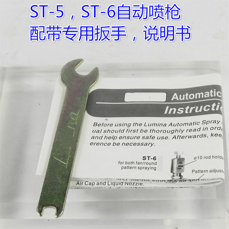 全套配置有:露明纳包装盒一只,自动喷枪一只,专用 扳手一只,皮管接头3(ST-5的2只),六角螺帽3只,说明书