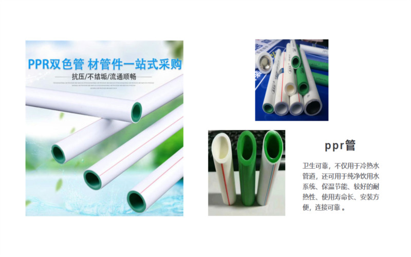 PP-R(polypropylene random)管,又称三丙聚丙烯管、无规共聚聚丙烯管或PPR管,是一种采用无规共聚聚丙烯为原料的管材。与传统的铸铁管、镀锌钢管、水泥管等管道相比,其具有节能节材、环保、轻质高强、耐腐蚀、内壁光滑不结垢、施工和维修简便、使用寿命长等优点,广泛应用于建筑给排水、城乡给排水、城市燃气、电力和光缆护套、工业流体输送、农业灌溉等建筑业、市政、工业和农业领域。