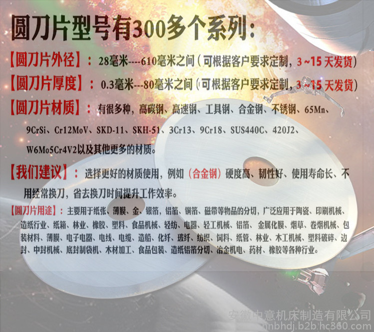 分切机刀片材料有:9CrSi、Cr12MoV、W6Mo5Cr4V2、W18Cr4V、SKD-11、SKH-51、YG8、YT15、SKS7、SK2、钨钢、高速钢等供用户选择。