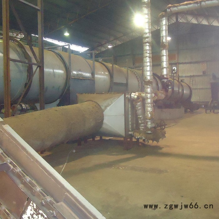 转筒烘干机主机是一略带倾斜并能回转的圆筒体。工作时湿物料由进料口加入,物料在筒体内被扬料板抄起,均匀地缓缓地洒下,并被推动向排料端缓缓移动。物料移动的过程中与筒体内顺流(也可定制逆流式)通过的高温气体和热的筒壁接触,使物料中的水分升温并变为水蒸汽。水蒸汽由引风机抽排出去,干燥后的物料由排料口排出,完成烘干过程。