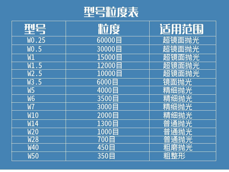 产品粒度:W0.25,W1,W1.5,W2.5,W3,W3.5,W5,W6,W7,W9,W10,W12,W14,W20,W28,W40等。
