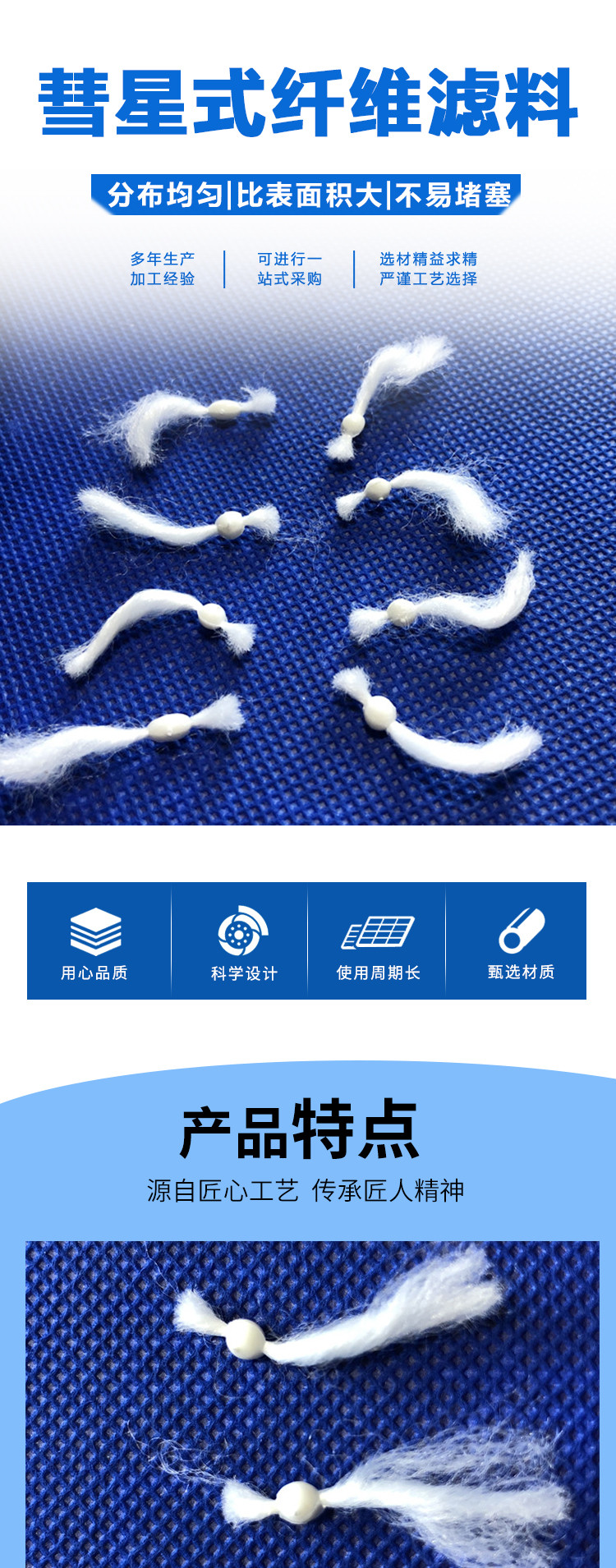 彗星式纤维滤料的持点是其一端为松散的纤维丝束,又称“彗尾”,另ー端纤维丝束固定在密度较大的“彗核”内。过送时,密度较大的彗核”起到了纤丝束的圧密作用,同时,又由于“彗核”的尺寸较小,对过断面空障军分布的均匀性影响不大,从而提高了床的截汚能力。气水同时反冲洗时,由于“核”和“彗尾"丝束的密度差,“彗尾"纤维丝束随反中洗水流散开并摆动,产生较强的用曳力,过速村料之间的相互碰撞也加剧了纤维在水中所受到的机械作用力,过村料的不规则形状使过材料在反中洗水流作用下产生旋转,强化了纤维在水中所受到的机械作用力,上述几种力的共同作用结果使時着在纤维表面的固体杂质拉很容易脱落,从而提高了过虑材料的洗度。