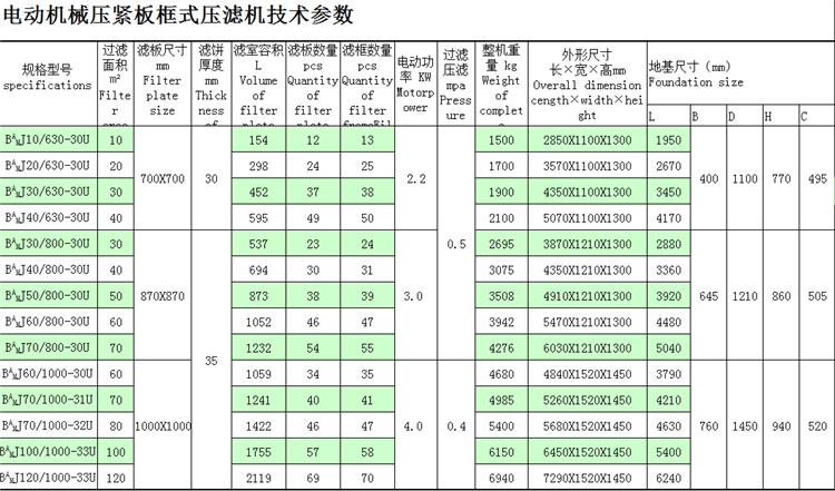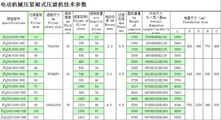 生产的系列压滤机规格型号有:320、450、630、800、1000、1250、1500、2000型,过滤面积0.5-1000平方,压紧方式:千斤顶压紧、机械压紧、液压压紧等。滤板材质有:增强聚丙烯、TPE弹性体、玻璃纤维聚丙烯、铸铁、不锈钢等。