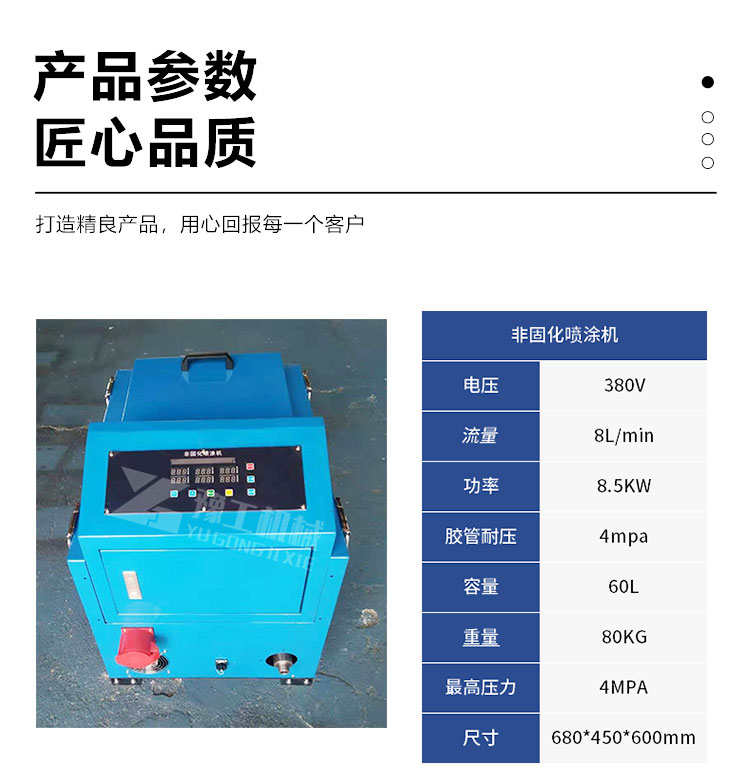 | YG-502 保温喷涂机 | 380V | 9KW | 50HZ | 105kg | 100kg | 490㎡/h | 900*700*800 |