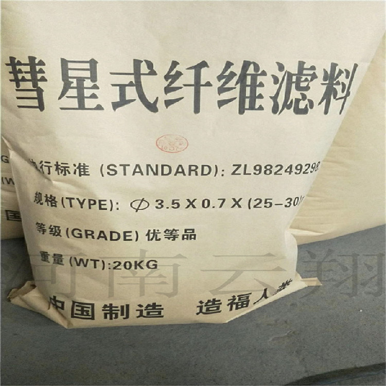 彗星式纤维滤料,形象地说即为——颗粒状的滤料象彗星一样拖着长长的“尾巴”—— 纤维。河南云翔生产的彗星式纤维滤料的特点是一端为松散的纤维丝束,又称“彗尾”,另一端纤维丝束固定在密度较大的“彗核”内。过滤时,密度较大的“彗核”起到了对纤维丝束的压密作用,同时,又由于“彗核”的尺寸较小,对过滤断面空隙率分布的均匀性影响不大,从而提高了滤床的截污能力。它既有纤维滤料过滤精度高和截污量大的优点,又具有颗粒滤料反冲洗洗净度高和耗水量少的优点,形成了一种新的过滤材料。