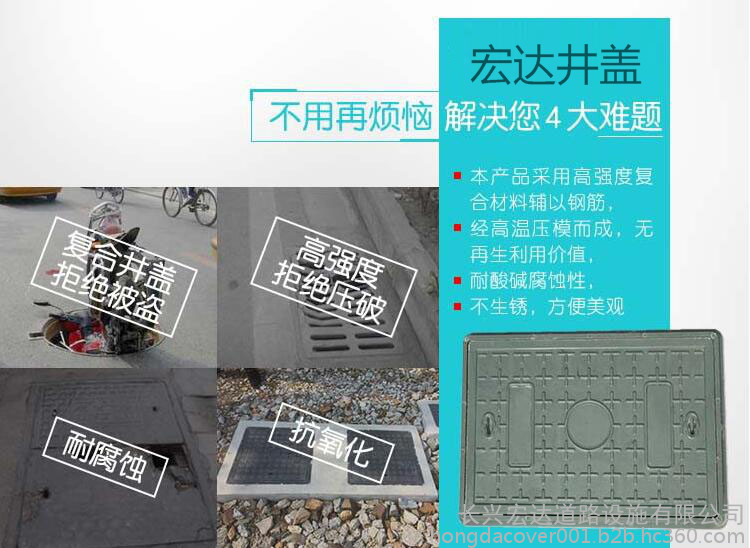 长兴宏达道路设施公司主要生产各类型井盖,产品包含排水沟盖板、地沟盖板、电缆沟盖板、复合树脂井盖、弱电井盖、沙井盖等。产品广泛应用于供水、供气、电力、市政、电信、高速公路建设等各种行业, 并可根据客户要求定做产品规格、行业图标等。