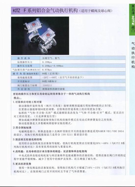 进口日本北泽KITZ气动球阀:气动内螺纹球阀是由双(单)作用气动活塞式执行器和内螺纹球阀组成。其阀体可分为整体式、二段式、三段式。阀座采用弹性密封结构,密封可靠,启闭轻松。阀杆采用有倒密封的下装式结构,阀腔异常升压时,阀杆不会被冲击。气动活塞式执行器采用低摩擦材料做成轴承套,缸体内外表面经硬质阳极氧化防腐处理,大大提高了气缸的使用寿命。本产品使用性能稳定,广泛的用于石化、冶金、电力、轻工、医药等工业部门