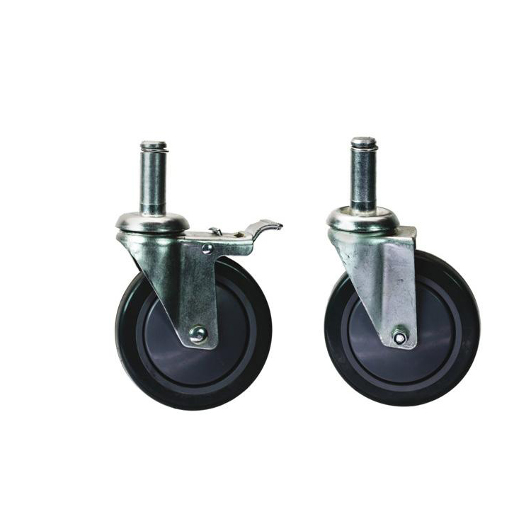 是前边两个固定轮,后边靠近推动扶手的是两个万向轮。脚轮有多种材料的脚轮,