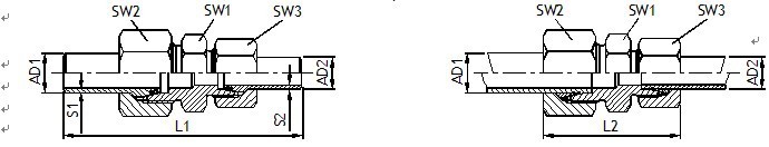 系 列 | 焊接 式 | 卡套 式 | 扩口 式 | 接头体 型 号 | 压力 (bar) | 管径 AD1 | 管径 AD2 | M1 | L1 | L2 | L3 | L4 | SW1 | SW2 | SW3 | M2 |