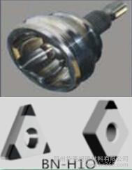 如车加工淬硬钢万向联轴节,淬硬钢万向联轴节硬度HRC60,精车加工淬硬钢万向联轴节选择华菱超硬CBN刀具BN-H10牌号,切削参数:ap=0.15mm,Fr=0.15mm/r,Vc=190m/min,实现高速切削,提高加工效率并且降低成本。粗加工选择BN-S20牌号,属于非金属粘合剂CBN刀具,耐磨性和抗冲击性优异,可大余量切削车加工淬硬钢万向联轴节。