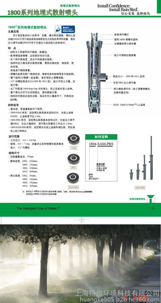 用于造型复杂的小块草坪、花圃、灌木等的灌溉。增加止溢功能(SAM)可用于坡地或地块高程变化大的低处草坪和花圃;增加压力调节功能(PRS)可用于水源压力波动较大的系统中。特点§ 材料为工程塑料和不锈钢,耐腐蚀。§ 配等喷强度喷嘴,达到更好的均匀度。§ 有5 种升降高度,适合不同高度的植物。§ 独特的压力激活多功能密封圈,整体压铸成型,强度高,密封性强。§ 高强度不锈钢返回弹簧。§ 喷嘴的选择范围广(没喷洒图形、喷射仰角和射程等多方面选择)。§ 嘴下滤网(与喷嘴一起装箱),更好地防止喷嘴堵塞。§ 1/2" 内螺纹旁进水口(1806 和1812 型),减少开挖土方量,安装方便。§ 出厂时配装1800-Pop-Top 冲洗堵头,防止安装时进入杂物。§ 整个喷头内芯可从顶部旋出,清洗维修方便。§ 独特的升降柱自清洗功能,保证任何土壤条件下,升降柱自如升降。 四种型号§ 基本型:普通灌溉条件下使用,不具止溢功能和调压功能。§ 1800-SAM 系列:该型喷头除具基本型特点外,内装止溢阀(SAM),止溢高度可达2.4m。§ 1800-PRS系列:该型喷头除具基本型特点外,内装压力调节器(PRS),当压力偏高时,调节喷头到**工作压力0.21MPa。§ 1800-SAM-PRS系列:该型喷头内装止溢阀和调压阀,因此具有上述三种特点。 运行范围§ 工作压力:0.1~0.48MPa§ 射程:0.9~6.1m,流量详见各种喷嘴性能参数表§ 接口:1/2"内螺纹 结构尺寸§ 顶部暴露直径:57mm§ 整体高度:1802:102mm; 1803:124mm; 1804:152mm; 1806:238mm; 1812:406mm;§ 弹出高度:1802:51mm; 1803:76mm; 1804:102mm; 1806:152mm; 1812:305mm;