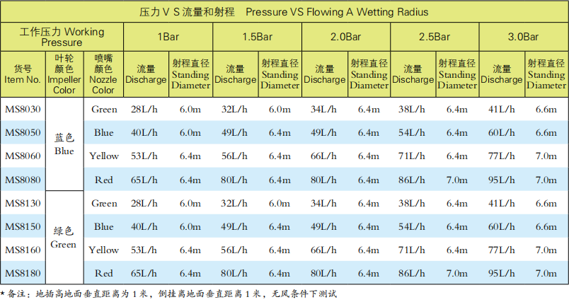 3、倒挂喷洒直径:3.0-5.0米;地插喷洒直径:6.0-7.0米。