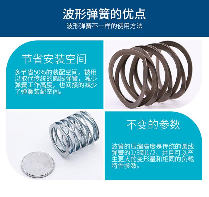 波形弹簧简称波簧,是金属薄圆环上具有若干峰谷的弹性元件。通常应用于载荷和变形量均不大,要求弹簧刚度较小需施加轴向预压力的场合。波形弹簧可以使用于需要减重的应用和受较小安装空间制约的应用, 经固定方法热处理并根据具体情况, 表面发黑,具有弹性。波形弹簧普遍使用于电机,纺织机械,液压设备,汽车等行业,可以安装与规格(公称尺寸)相适宜的轴承室或孔内,安装空间很小,具有降低噪音,减小振动的功能。