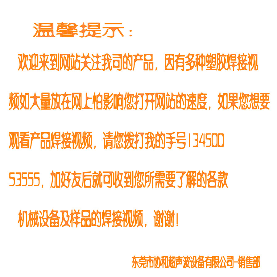 首先欢迎您关注我司的产品,我司是主要生产超声波焊接设备,旋熔机焊接设备,热板机焊接设备,振动摩擦机焊接设备,诱导机焊接设备,自产处销,维修、配件,制作相关模具,代客加工等一条龙服务。我司以多种经营的理念,也为了减少客户在没有明确接单量多少的情况下,先不用购买设备,愿意为您按产品要求我司有超声波机,热板机,振动摩擦机等塑胶焊接机代为加工,如果后期单量大可以说考虑把设备买回去生产。也可长期保持代为加工。一,方便了客户,二,减少客户的压力。
