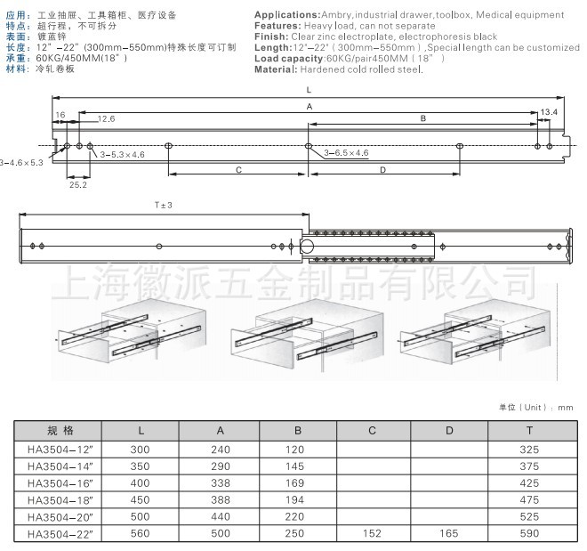 应用: 需全展的重载型抽屉 特点: 英制孔位,叠加型侧装式路轨,不可分离抽出时带制动