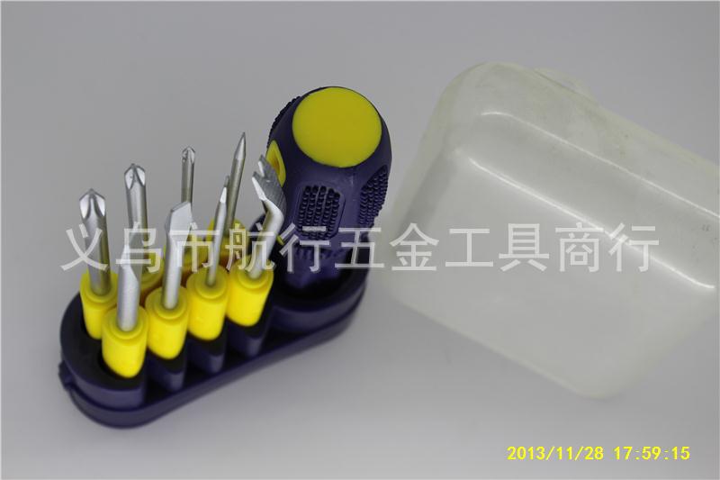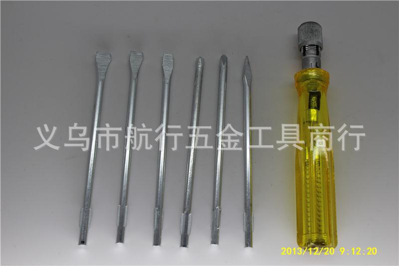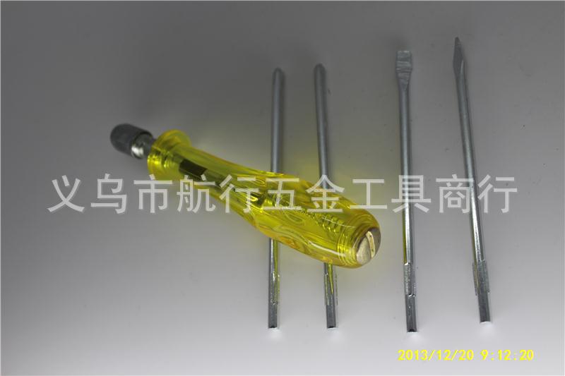 产品内装有一字4#和二支十字(0#、1#)及一支尖头共四支不同规格的螺丝刀杆,长度约8.0cm、直径3.3mm,黄色透明柄长10cm。装配好长度约16cm。拆装轻巧、使用方便。透明塑料盒包装。细节图还有:
