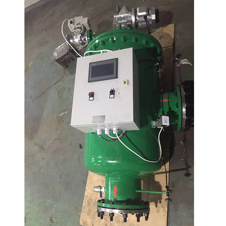 自清洗过滤器用于去除水中的各种粘性物质、胶粒、泥沙及其它机械杂质,确保系统设备的安全可靠。主要由筒体、不锈钢滤网、电动阀及排污装置所组成。当水处理器工作时,球阀开启,水流由入口进入过滤器,经过滤网过滤流出系统。水处理器需要排污时,关闭蝶阀,打开排污阀,水流经滤网后半段外侧流入内侧,经前半段过滤,部分水流由出口流入系统,剩余水流由滤网后半段外侧流入内侧,经排污口排出,起到反向自动冲洗滤网作用。