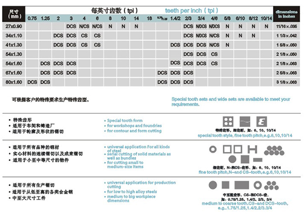 我们能够为客户随时提供各种特殊规格(长度、宽度、齿形、齿数的锯带)。