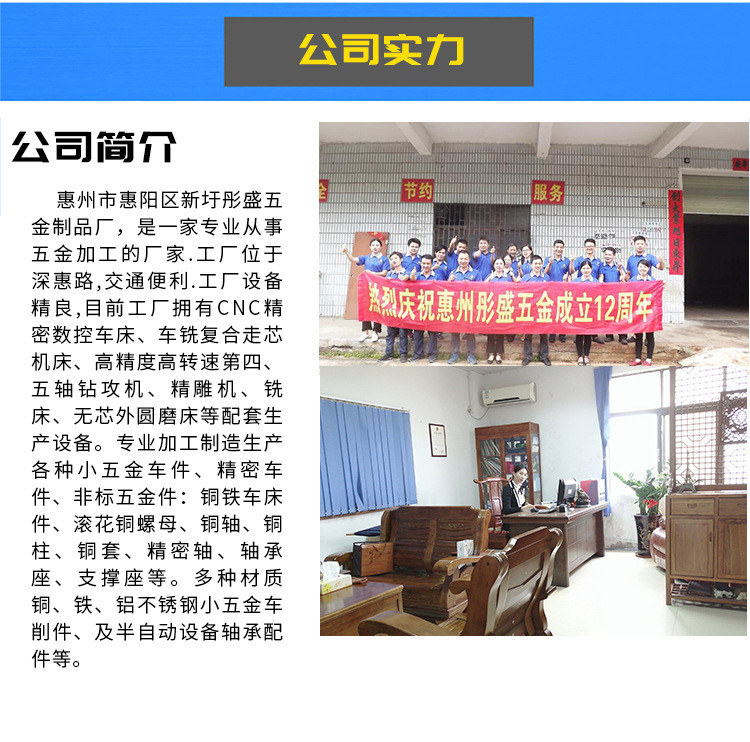 本公司主要加工精密五金零件、非标零部件、铜铁车床件、精密长轴,滚花铜螺母铜柱,不锈钢螺栓螺杆,铝合金配件业务范围:CNC加工、数控车床加工、走芯机长轴加工、车铣复合加工、高转速4轴钻攻机加工