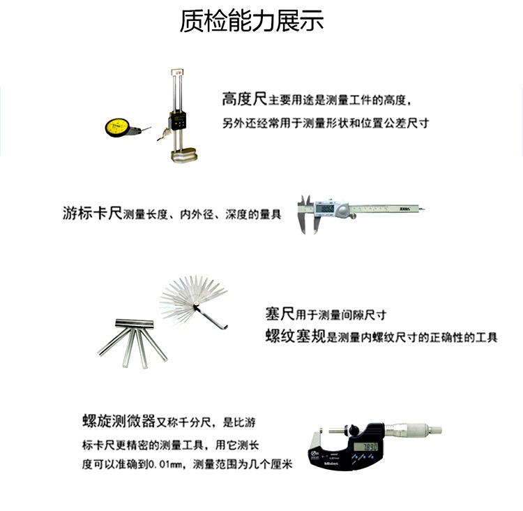 ★表面处理 :电镀、拉丝抛光、喷砂阳极氧化、镭射打标、磷化等(按客户要求) ★常用材质 :sus303;sus304;sus316不锈钢、碳钢、易车铁、铝合金、黄铜、POM塑胶类提供加工服务 ★零件的加工精度:尺寸公差可以达到±0.01MM; 一次性加工同心度⊙0.01MM;一次性加工平行度∥0.05MM;单边垂直度⊥0.05MM ★加工设备: CNC数控车床,CNC加工中心,4轴加工中心,车铣复合机,走芯机 ★检验检测设备:卡尺,千分尺,塞规,螺纹规,高度尺,高度表,二次元,投影仪★品质控制:来料检验,首件检验,巡检,抽检,出货全检