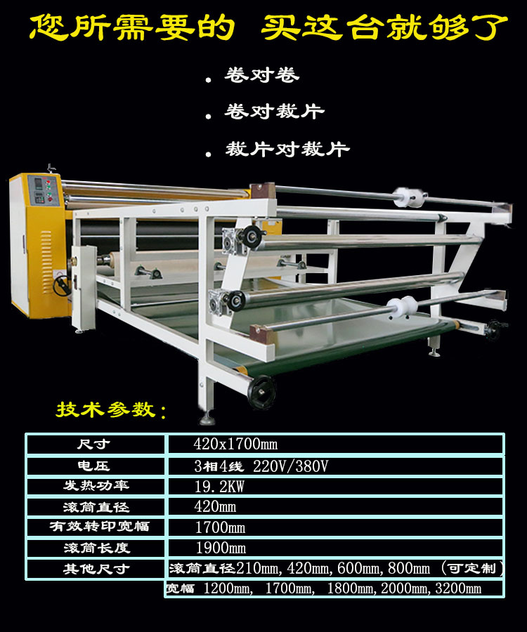 1.7米转印宽幅滚筒热转印 布匹卷对卷滚筒热转印机技术参数: