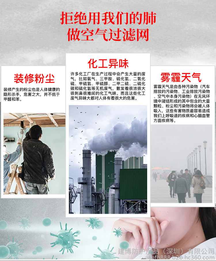 3.口罩用途:透气性好 不闷 可达到防尘的功效 鼻梁处带有铝条可起固定的作用.无微粒超声波密封边缘,佩戴舒适.
