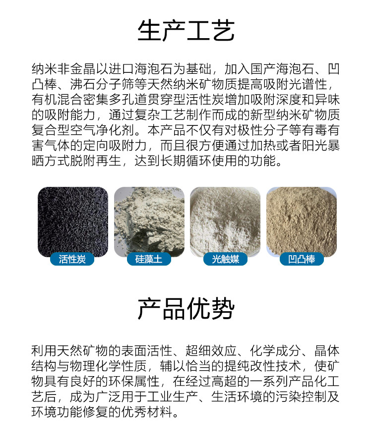 六、主要成分:光触媒、凹凸棒土、活性炭、膨润土、硅藻土、沸石、海泡石、铝土矿等