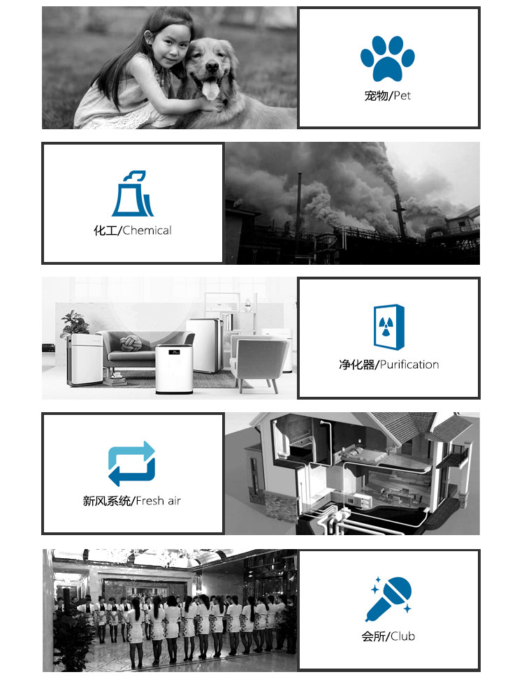 本产品可以应用为:公仔填充物吸附剂、空气净化炭包、车用透明纱袋除味剂、透明除臭盒、净化器滤芯等空气净化领域。