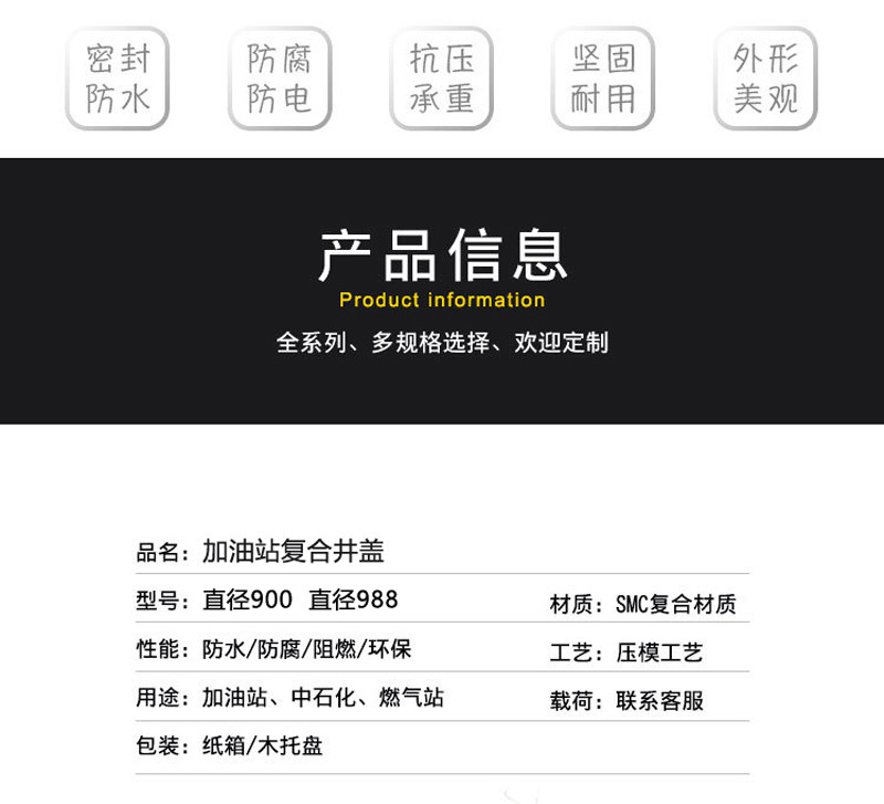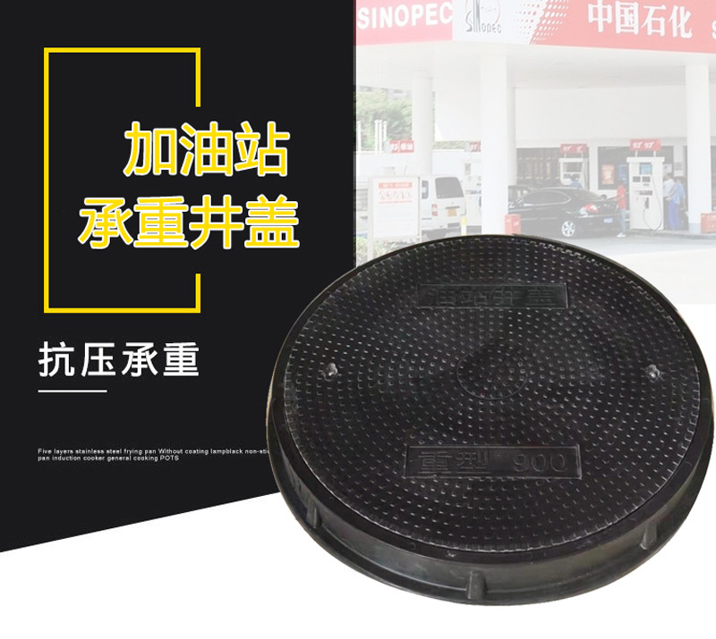 专用导电防水圆形复合人孔井盖MRC9000系列,由复合人孔井盖、复合井框和防水密封圈三部分组成,井框有效开孔直径为900mm,常用于加油站前院机动车行驶区域中的人孔井上,较高承重荷载,可以承受80吨卡车通过。