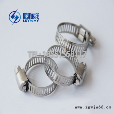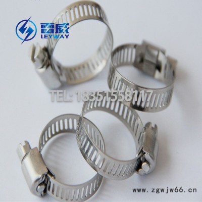 美式不锈钢喉箍,材料钢带宽度和厚度分别为8mm,12mm和0.6mm,此卡箍用途广泛,除汽车五金市场以外,也可用于家庭日常水暖以及液化气软管的维修。此类喉箍轻巧、紧凑的设计使其在受限的环境下得以轻松安装!喉箍的材质不同,其耐腐蚀性的强度也不同,客户可根据自己的实际应用选择合适的喉箍。