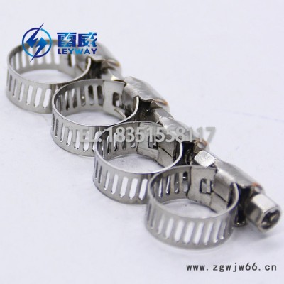 美式不锈钢喉箍,材料钢带宽度和厚度分别为8mm,12mm和0.6mm,此卡箍用途广泛,除汽车五金市场以外,也可用于家庭日常水暖以及液化气软管的维修。此类喉箍轻巧、紧凑的设计使其在受限的环境下得以轻松安装!喉箍的材质不同,其耐腐蚀性的强度也不同,客户可根据自己的实际应用选择合适的喉箍。