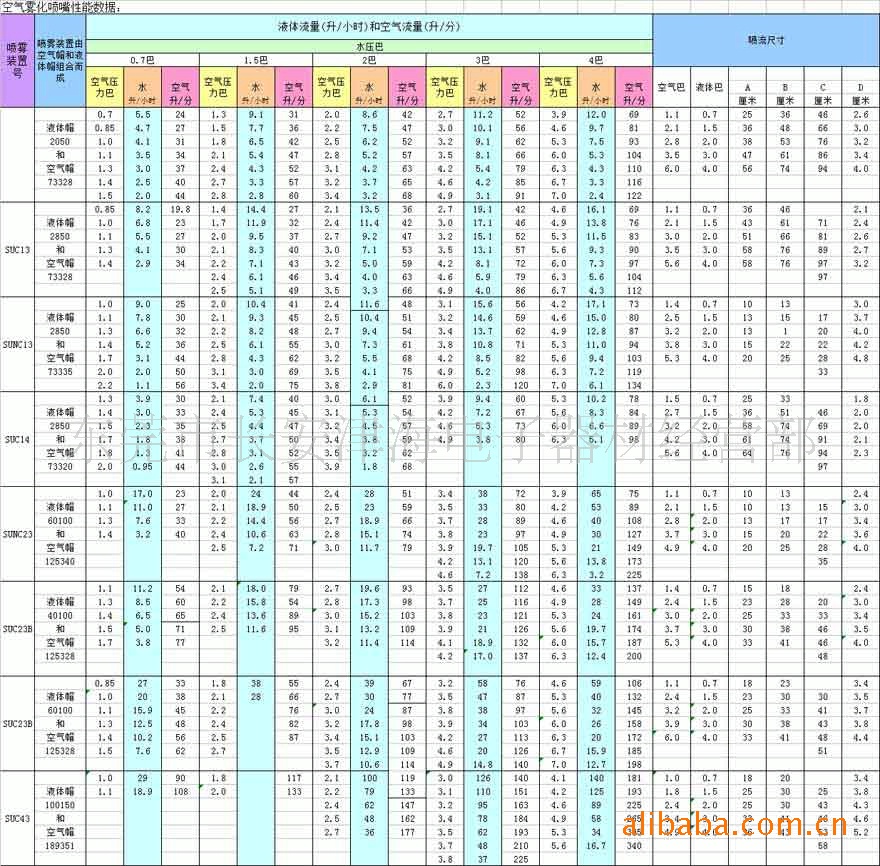 精细雾化喷嘴、二流体喷嘴的设计特点:自动精细雾化喷嘴可提供液体雾化气体和风扇气体压力的独立控制,以进行流率、液滴大小、喷雾分布和覆盖范围的精细调整。科学合理的设计使得喷嘴在对黏滞液体喷雾时也很理想。 可对独立的气体雾化管路进行调整,以改变雾化液滴大小而不影响液体流率。采用一个附加的入口/出口通道使液体再循环,这可有效地维持黏滞液体的流动。驱动内装喷嘴清除针阀装置可消除喷嘴有堵塞。 自动精细雾化喷嘴可使用七个不同喷雾装置中的任何一个。所提供的流率范围为2.8升/小时到179升/小时。可在几秒钟之内对雾化气体、风扇气体和液体流率进行调整。及再调整。因此,能够改变设置以适合各种不同的喷雾应用。供选择时调时控制器能够达到每分钟180周期的自动“开/闭”运行。气缸运作至少需要2.4巴的气压