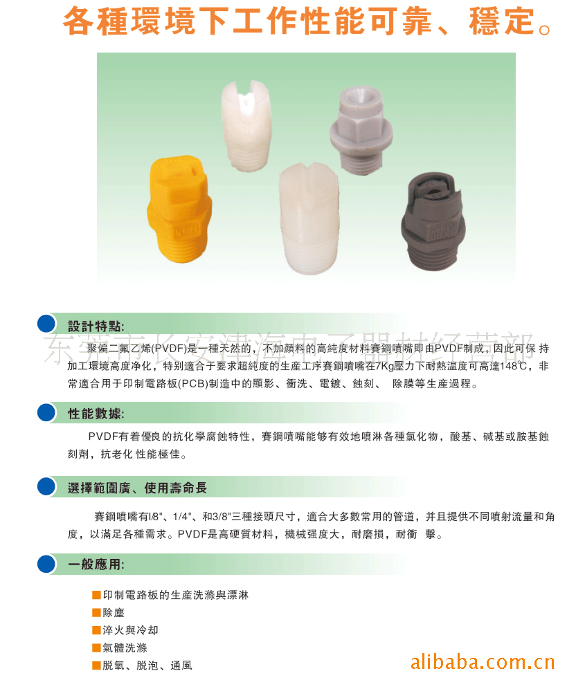 ●抗腐蚀:PVDF有着优良的抗化学腐蚀的特性,能够有效的喷淋各种氯化物、酸基、胺基或者碱基蚀