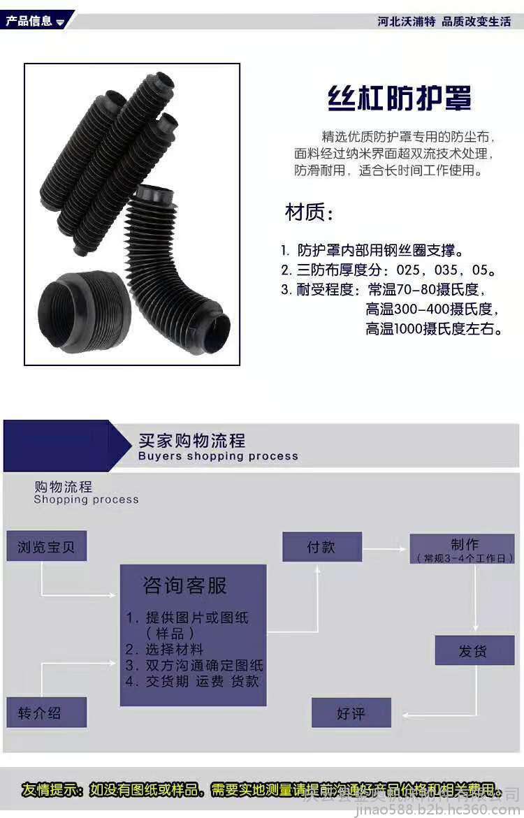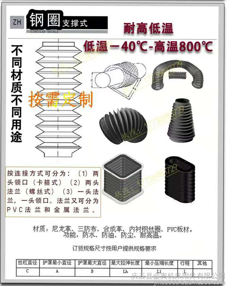 ??产品特点:一完全防漏可任意弯曲伸缩管的直径和长度不受限制均可按客户要求制作。连接方式:一两端颈口卡箍连接;二两端法兰用螺丝连接;三一端颈口卡箍连接一端法兰螺丝连接。材料:专用布内衬钢丝三防布;内衬钢丝塑胶布;内衬钢丝石棉布;内衬钢丝耐高温布;内衬钢丝阻燃布;内衬钢丝防火布;内衬钢丝防油防水布;内衬钢丝。定货要求:客户必须提供一拉伸后的长度;二收缩后的厚度;三保护件的直径;四护套的外径要求连接方式;五使用环境及材料要求技术说明。一般护套拉伸后的长度与收缩后的厚度比值为一米比十五厘米也可按客户要求加工制作比值更大或更小的伸缩护套产品此产品已广泛引用于炼钢,铸造,石油,探矿,金属调质等领域