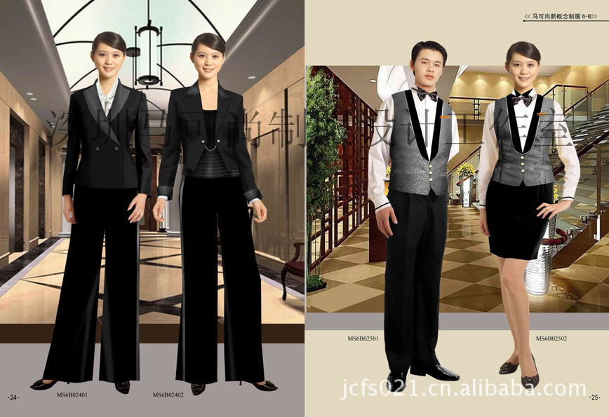 上海谨诚服饰专业订做酒店职业服装主要包括各种酒店服务员服装、迎宾服、传菜装、男女西装、收银服、门童服、司法行政服、等各式职业工作服装!并可根据客户要求进行印花绣字定织定染业务!经过近几年的发展积累有上万种款式可供各新老客户选择订购!