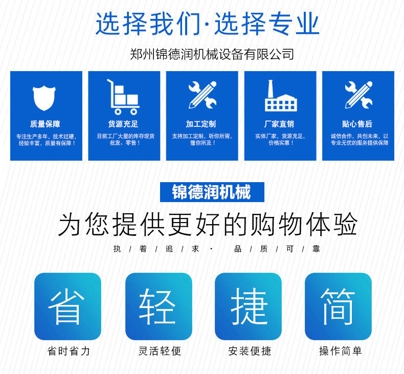 锦德润机械将遵循“服务营销”理念,一如既往,充分有效利用资源优势、人才优势、研发优势等,以更好的产品、更好的质量,全新的形象,为用户提供更优的服务。